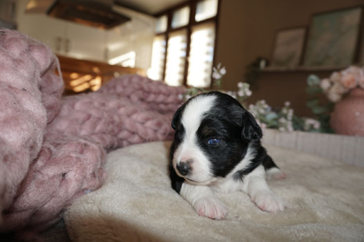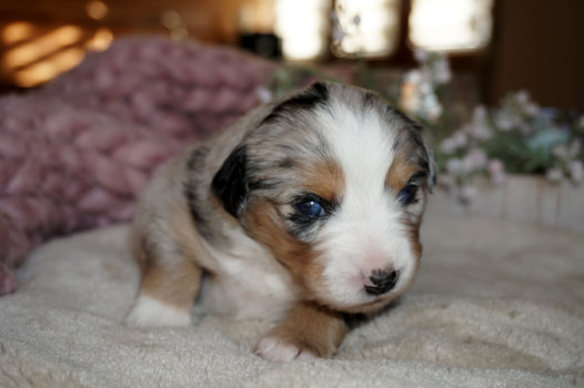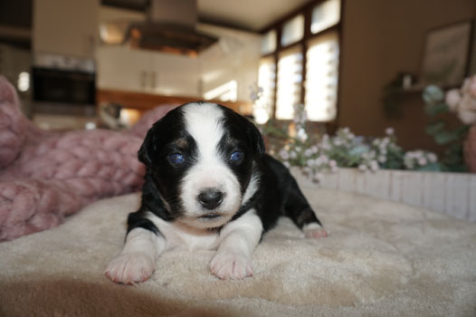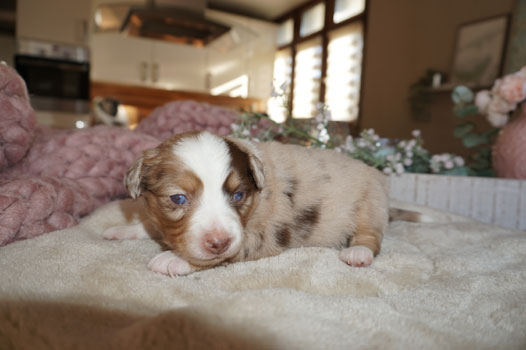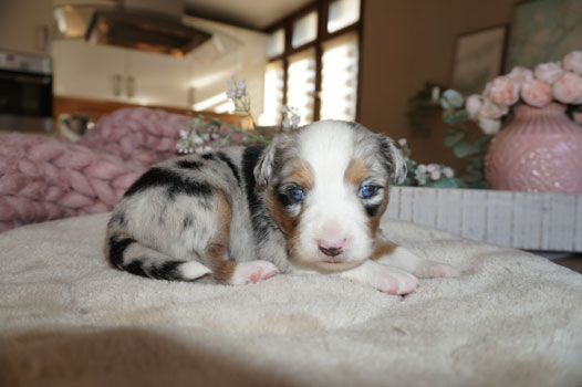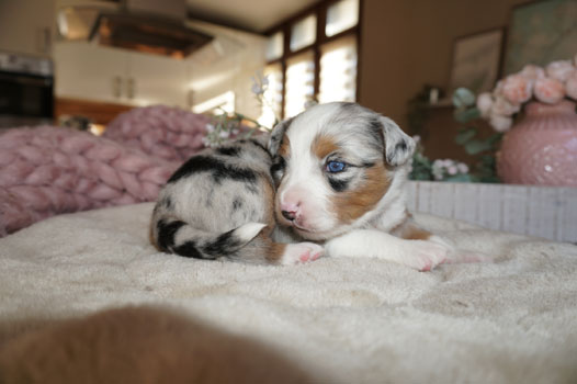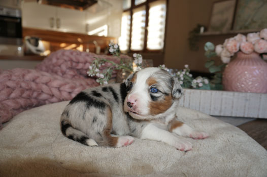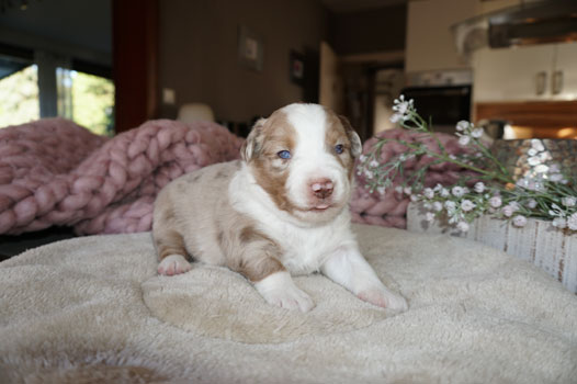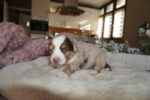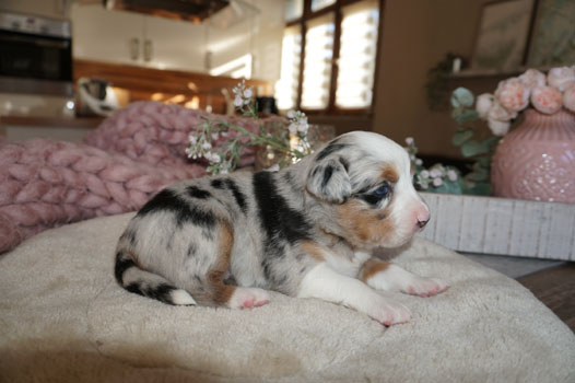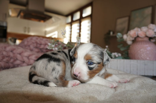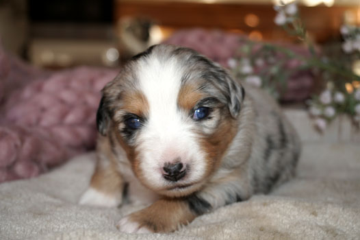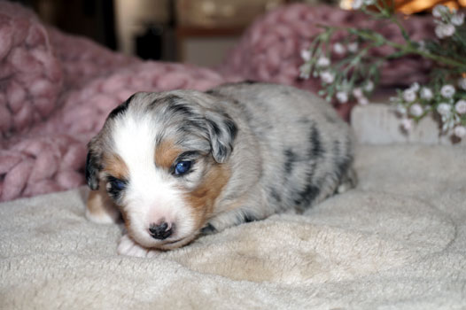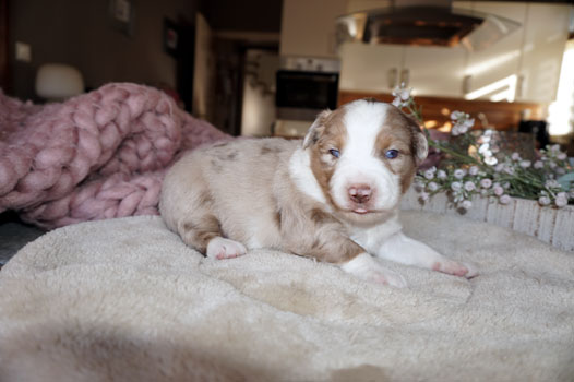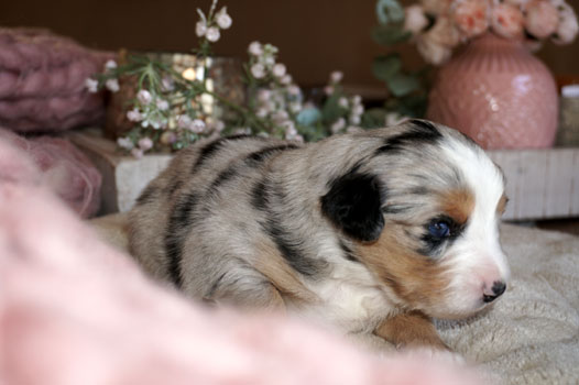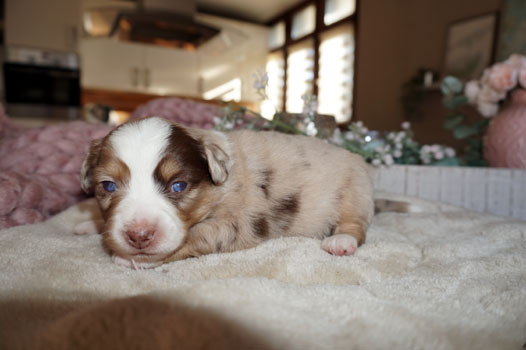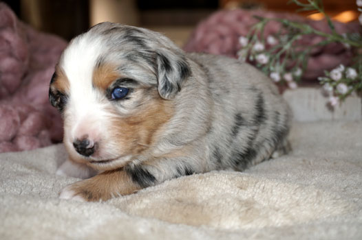 Bluemerle Mädchen mit breiter weisser Blesse, kleiner Typ Hund in der Endgrösse der Eltern, Optik eher Mama von der Kopfform, aktivere Mentalität, Typ intelligent und mutig.