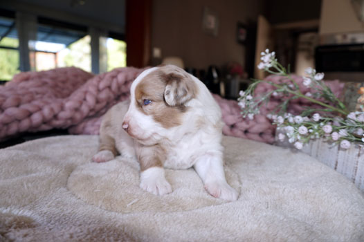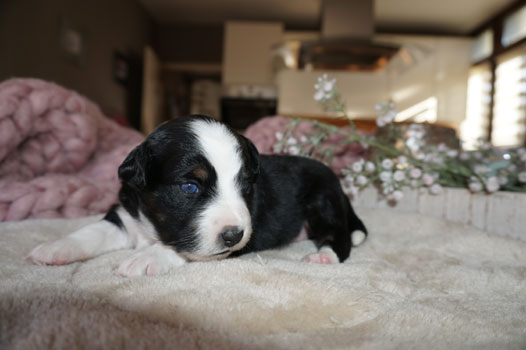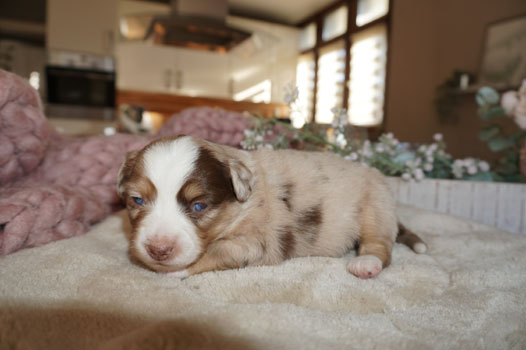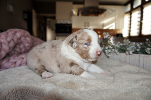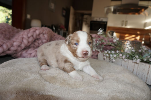 Bluemerle Mädchen mit breiter weisser Blesse, kompakterer Typ Hund in etwas grösserer Endgrösse als die Eltern, Optik Papa, ruhig und entspannte Mentalität (wahrscheinlich wie Opa Nox).
