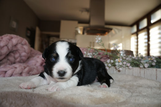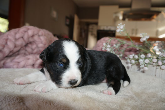 Blackbi Mädchen mit breiter weisser Blesse und halbem Kragen, kleiner Typ Hund in Grösse und Optik der Mama, mittlere Energie, eher mutig und dominant.