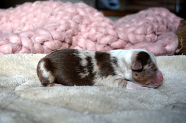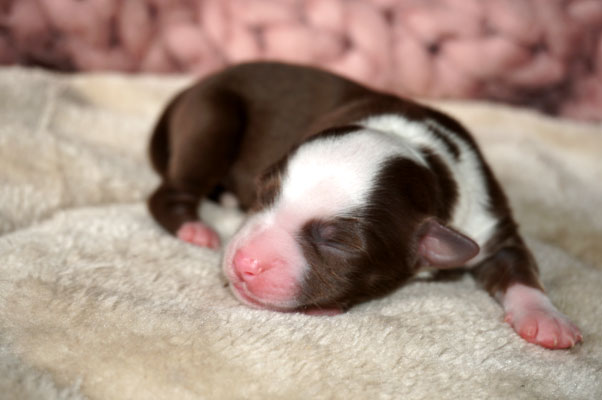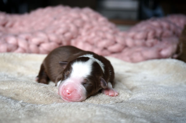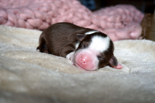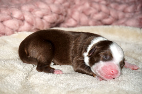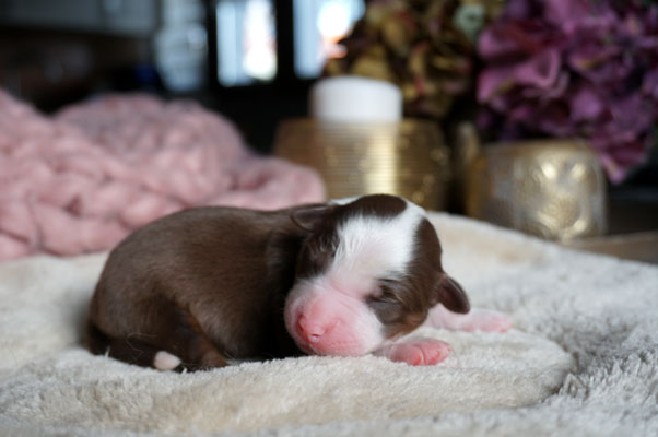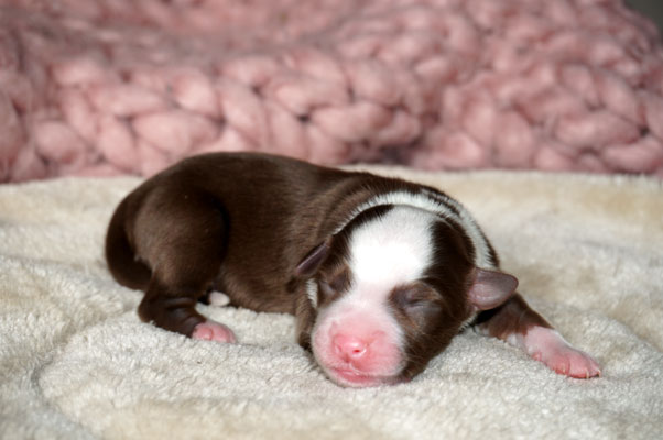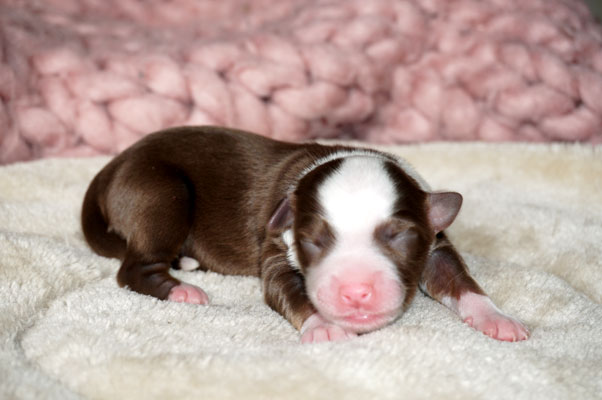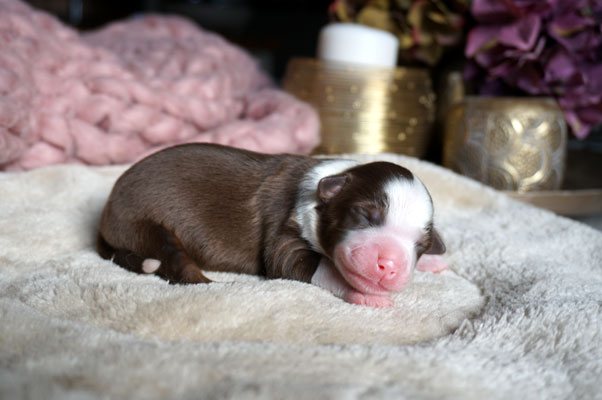Redtri Hündin mit Gesichtsblesse, breiter Kragen mit Punkt im Nacken, Endmass wahrscheinlich ähnlich der Eltern, optisch und charakterlich total Mama vom Typ, eher ruhig.