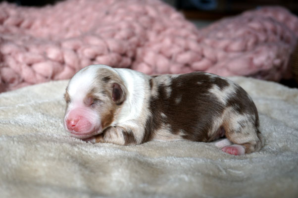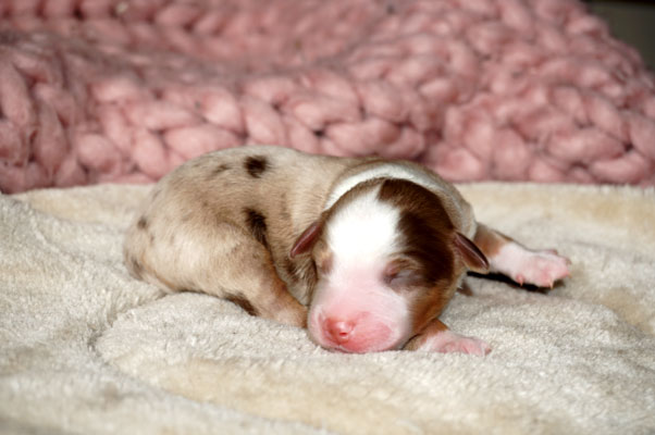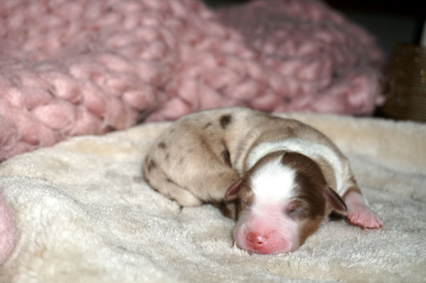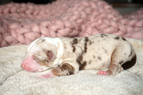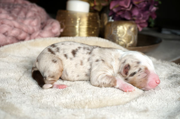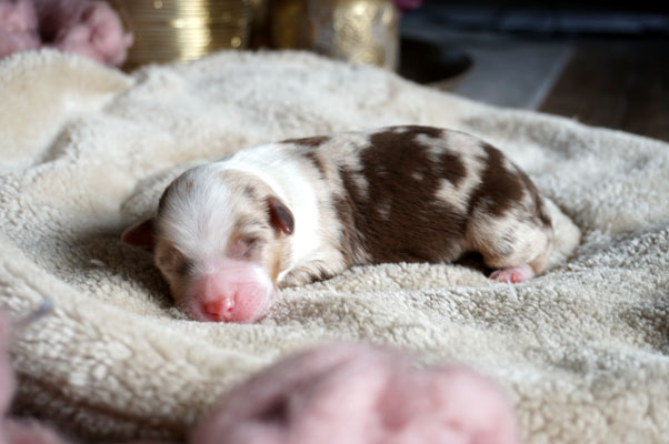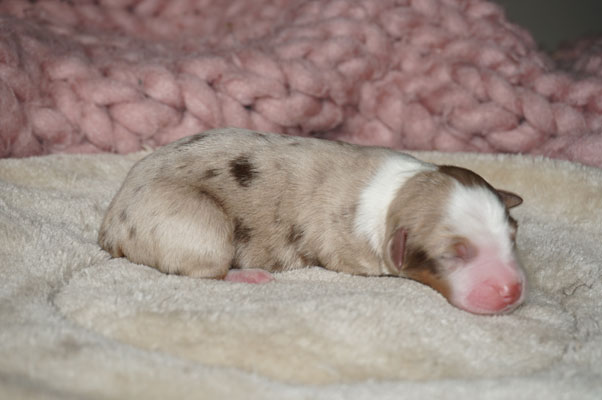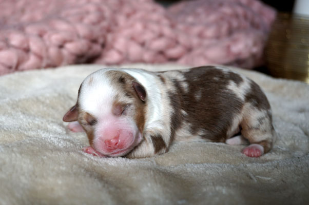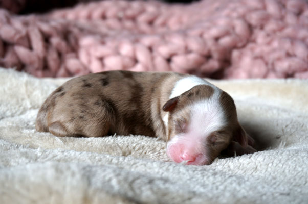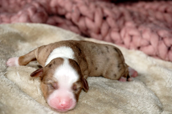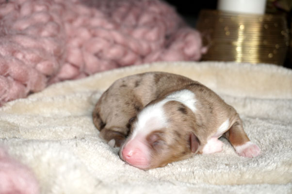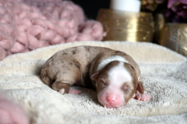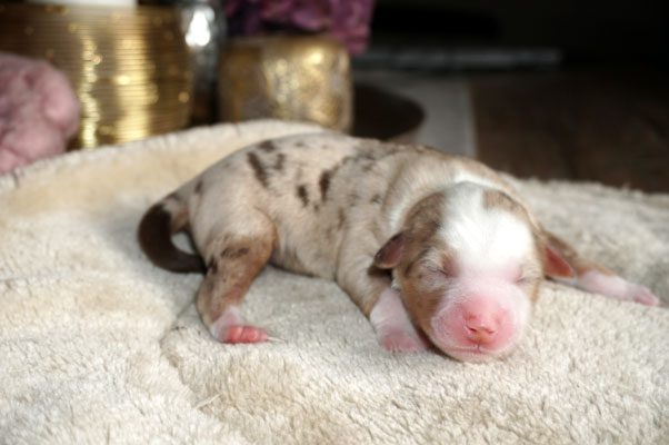 Redmerle Hündin mit Gesichtsblesse, breiter Kragen, grosse Merle Patches, intensives Kupfer im Gesicht, optisch zarter Typ Hund wie Mama, Temperament mittelstark.