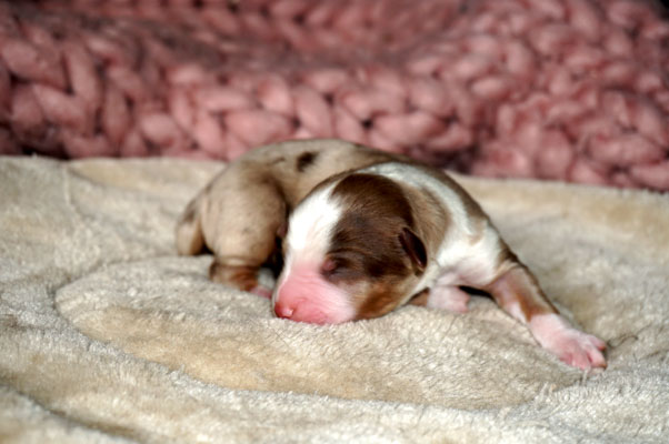 Redmerle Rüde mit breiter Gesichtsblesse, dunkles Kupfer im Gesicht und den Beinen, weisser breiter Kragen, grosser brauner Patch im Gesicht (sog. Splitface), kompakter Typ Hund (ähnlich Opa Nox), Endmass wie die Eltern, Charakter eher ruhig aber durchsetzungsstark.