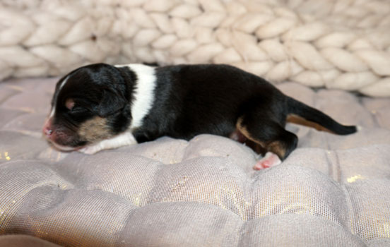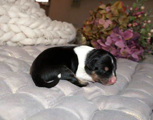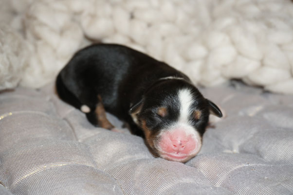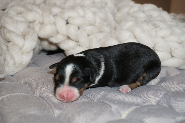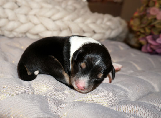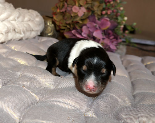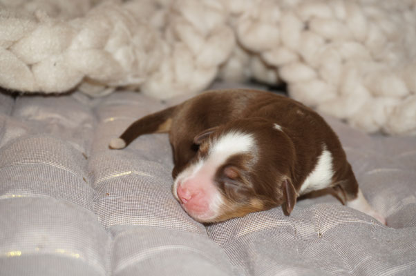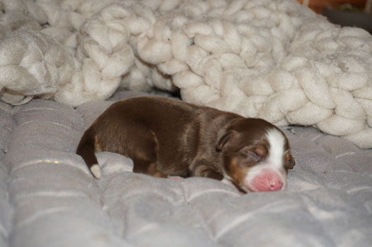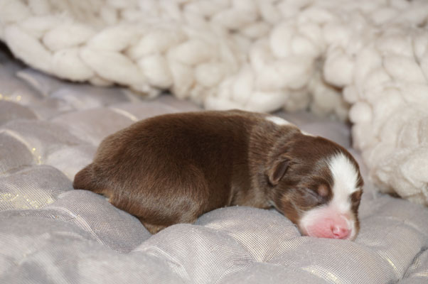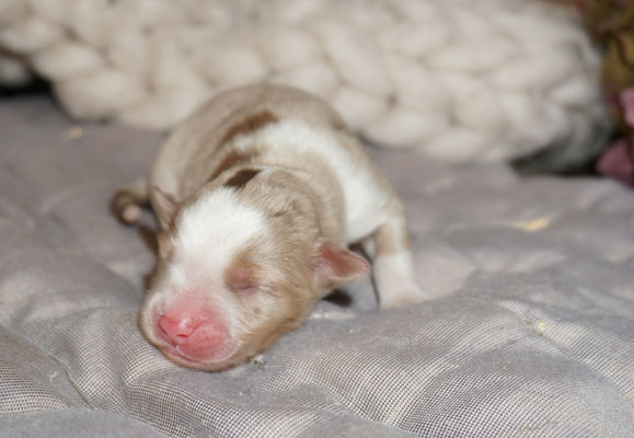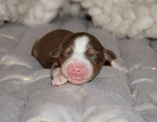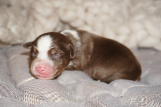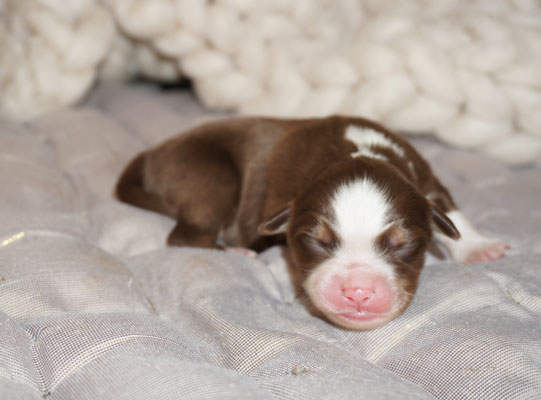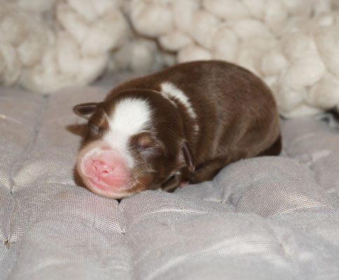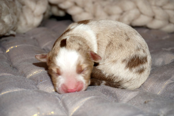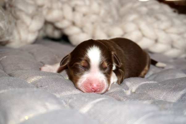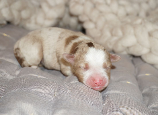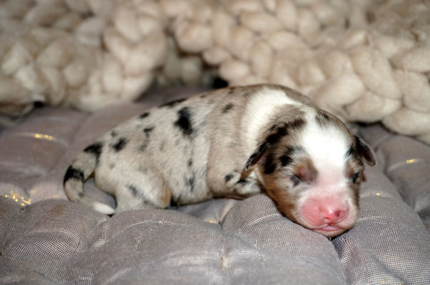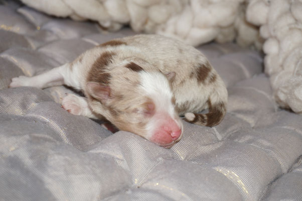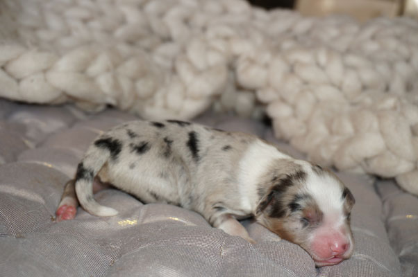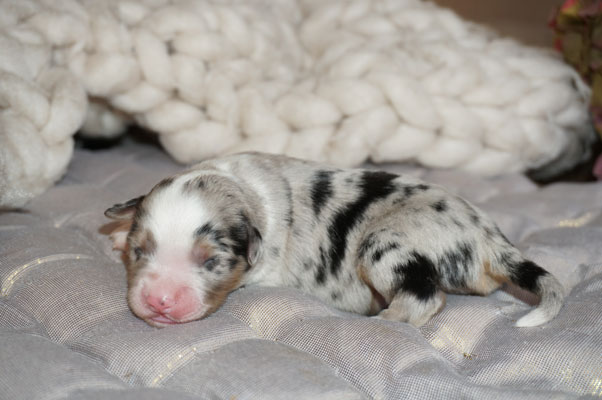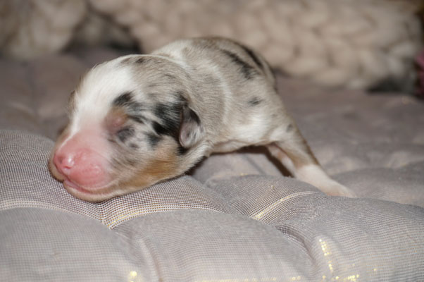 Bluemerle Rüde mit breiter weisser Blesse, halber Kragen, ausgeprägtes Kupfer im Gesicht und den Beinen, helles Merle mit kleinen Spots, etwas aktivere Mentalität mit einem Endmass um ca 42 cm, optisch vom Kopf Papa Perfect.