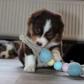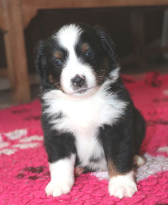 Redtri Hündin mit Gesichtsblesse, breiter Kragen mit Punkt im Nacken, Endmass wahrscheinlich ähnlich der Eltern, optisch und charakterlich total Mama vom Typ, eher ruhig.